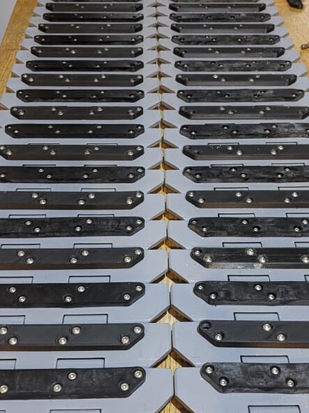 This is a small insight into the make up for the tracks, which for those interested were originally made from a conveyor system! Each link is made from a long lasting very strong plastic and every link had to be drilled 8 times allowing us to attach one of two types of track pads, a 3d printed plastic pad and the other made of a durable rubber material specifically designed to reduce noise when moving but also reduce the damage to the tracks over time. Each other pad being rubber will mean he also has a bit more friction and therefore arguably more traction. As mentioned, each link was drilled 8 times, each track pad is attached by 8 bolts and we have around 50 links per track. It took the majority of two full days just to bolt on the pads! I can’t wait to do this on my own build…..with some help from Dave!